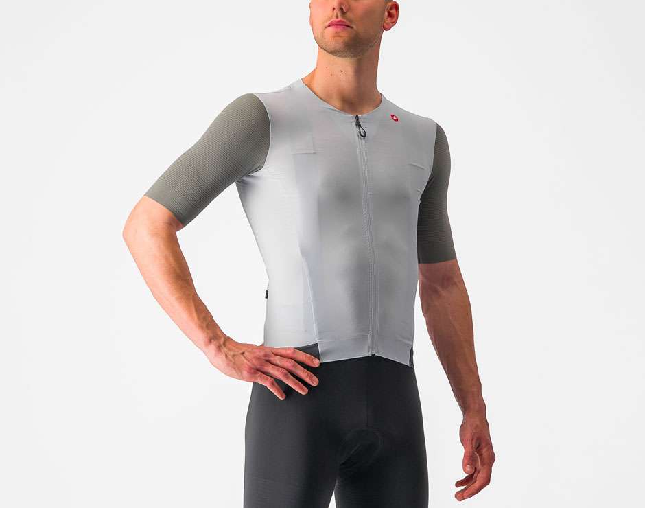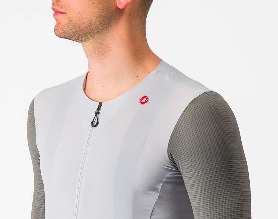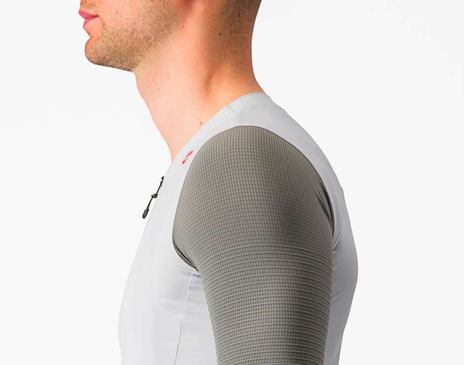Le panneau d'épaule est constitué d'une maille extensible recyclée, offrant à la fois confort et aérodynamisme. La construction sans col renforce les propriétés de légèreté et de refroidissement du maillot.